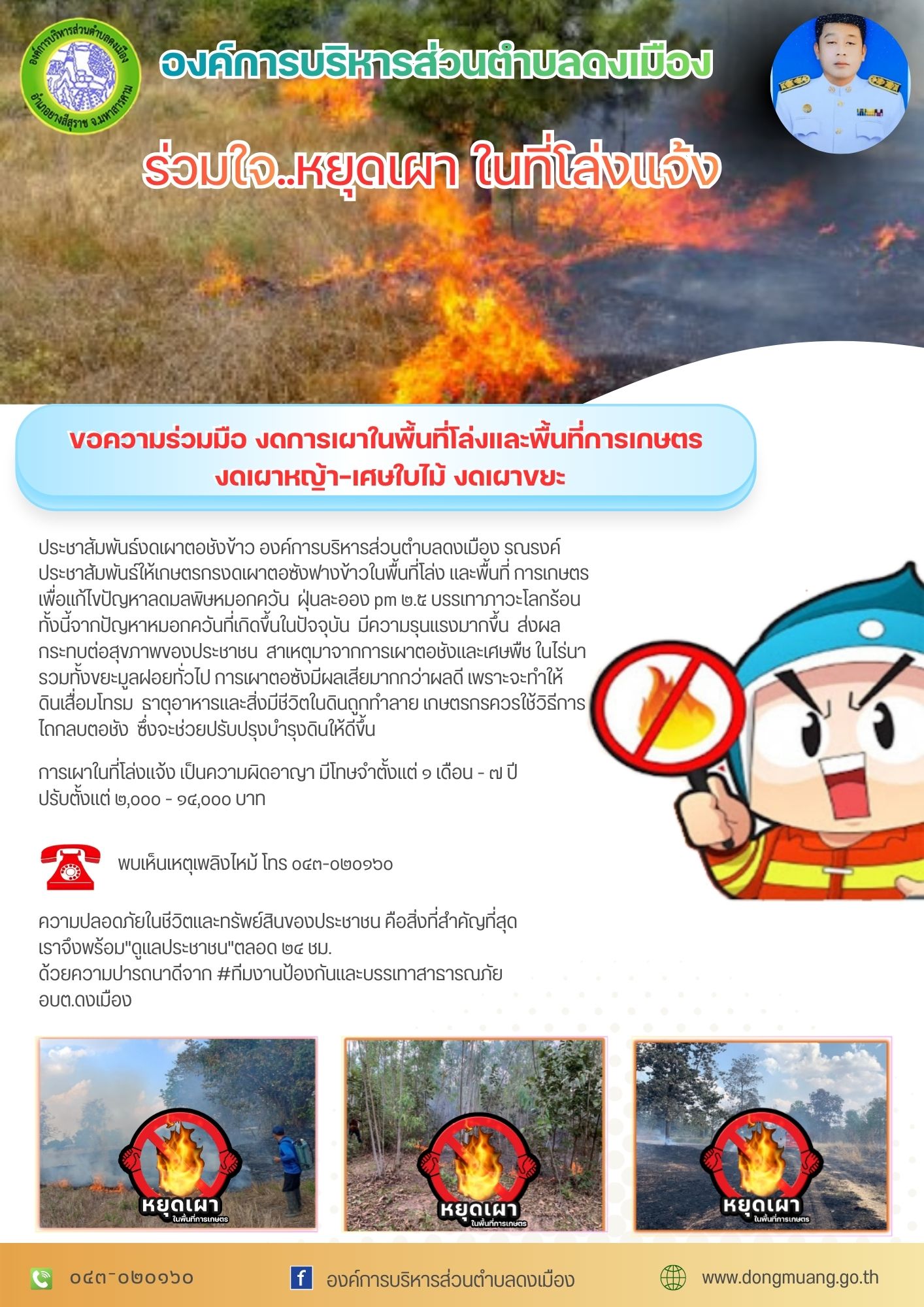 ประกาศองค์การบริหารส่วนตำบลดงเมือง เรื่องขอความร่วมมือ งดการเผาในพื้นที่โล่งและพื้นที่การเกษตร งดเผาหญ้า-เศษใบไม้ งดเผาขยะ